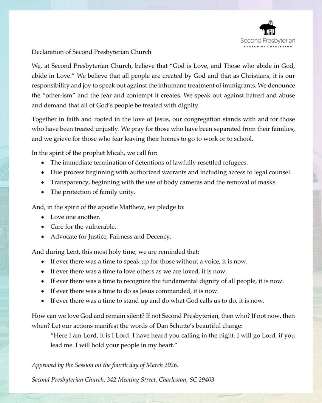 The Session charged a group of Elders last month to draft a Declaration of Faith from Second Presbyterian Church of Charleston and its Suburbs decrying the abhorrent treatment of immigrants in our nation and fulfilling our responsibility to speak up and out, demanding that all God’s people be treated with dignity.