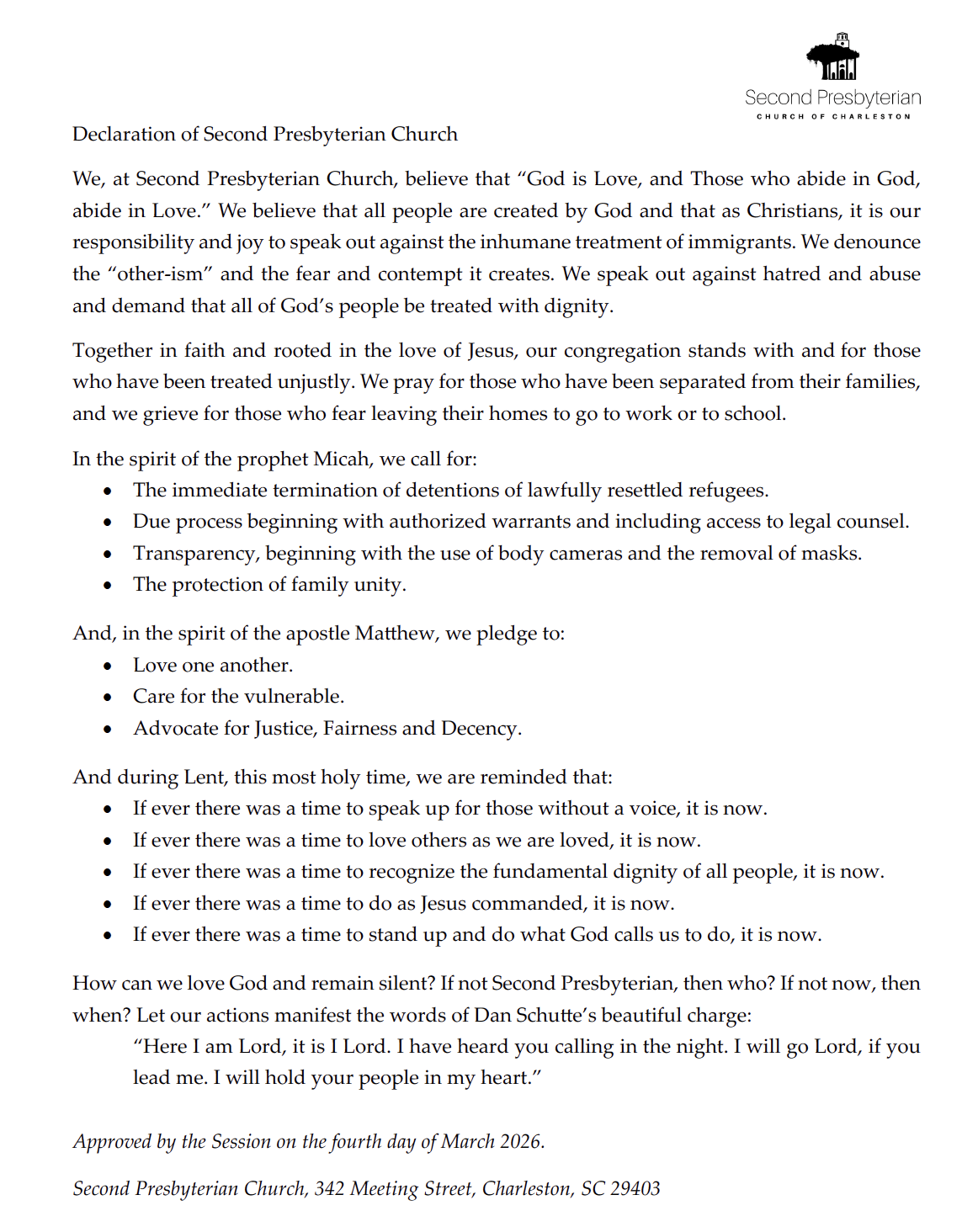 The Session charged a group of Elders last month to draft a Declaration of Faith from Second Presbyterian Church of Charleston and its Suburbs decrying the abhorrent treatment of immigrants in our nation and fulfilling our responsibility to speak up and out, demanding that all God’s people be treated with dignity.